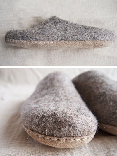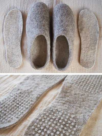 【お手入れについて】フェルトシューズは、洗わない方が長持ちします。普段のお手入れは、テープやブラシなどで表面の埃をとる程度がお薦めです。保管の際は、優しく手洗いの上、軽く脱水して形を整えて干し、完全に乾かしてから、防虫・防湿の上、保管下さい。取り外し可能な中敷は、こまめに洗えて便利です。