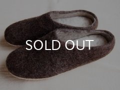 一足ずつ手作りのピュアウール・フェルトルームシューズ(レザーソール付き)です。チクチクしないので、ぴったりサイズを素足で履くも良し、毛糸の靴下も履きこんで、大足であったか過ごすのもお薦めです。フェルトは使ううちにより足に馴染み、より履き心地がよくなります。羊に包まれているかのように軽くて温かく、冬はもちろん夏の冷房で足下が冷えるお部屋でも、蒸れずに快適です。茶色のシューズは、毛の強さにより羊を感じられる、羊の毛そのままの茶色。染色をしていないので、より自然。その温かさは、部屋で一緒に過ごすのが愛おしくなるルームシューズです。