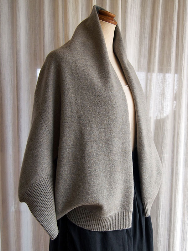 ウールカシミヤのボレロ[雪/グレージュ]です。そのなめらかな手触り感はうっとりするほど。写真は襟元をボリュームたっぷりで着て頂くバージョン。これを上下逆に着ると襟元すっきり丈長バージョンで着られ(ページ下写真参照)、ボトムのボリュームに合わせて色々なスタイルでお楽しみ頂けます。ボレロを広げて1枚のケープとしてまとうのも素敵。または、ケープをくるっとたたんでマフラーとしても。コートを着て出掛ける時はマフラーに、脱いだ後はボレロとして着られ、気温差が大きい場所等の移動など、とても重宝です。ウールのしっかりとした温かさと、カシミヤの軽やかな温かさを兼ね備えたボレロです。何通りも着られる便利な1枚は、手放せなくなります。